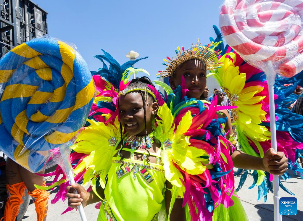 TORONTO, 16 junio, 2024 (Xinhua) -- Imagen del 15 de junio de 2024 de niños disfrazados posando para fotografías durante el lanzamiento oficial del Carnaval Caribeño de Toronto 2024, en Toronto, Canadá. El evento se celebró aquí el sábado, marcando el inicio de una temporada festiva anual con vibrantes muestras de la cultura caribeña. (Xinhua/Zou Zheng)
