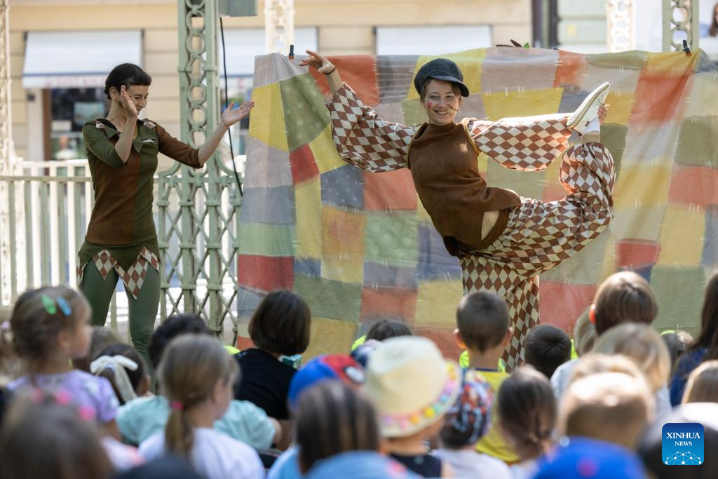 LIUBLIANA, 17 junio, 2024 (Xinhua) -- Niños lanzan anillos durante el Festival Internacional de Clown Contemporáneo y Nuevo Circo, en Liubliana, Eslovenia, el 17 de junio de 2024. El Festival Internacional de Clown Contemporáneo y Nuevo Circo se lleva a cabo aquí del 17 al 23 de junio. (Xinhua/Zeljko Stevanic)