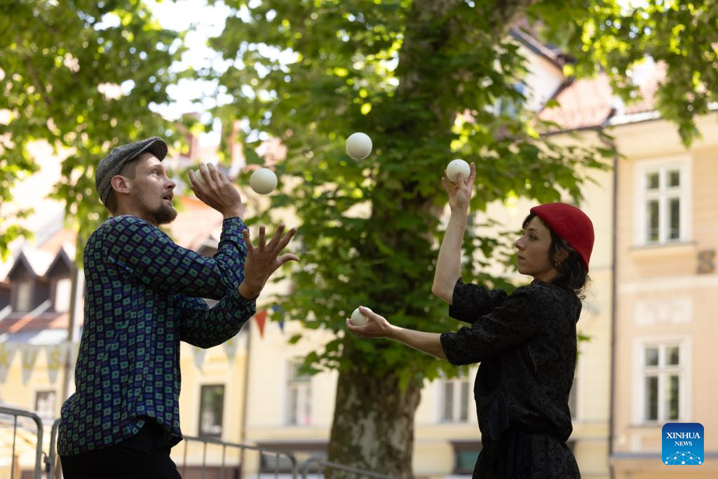 LIUBLIANA, 17 junio, 2024 (Xinhua) -- Acróbatas realizan una presentación de cascada de pelotas durante el Festival Internacional de Clown Contemporáneo y Nuevo Circo, en Liubliana, Eslovenia, el 17 de junio de 2024. El Festival Internacional de Clown Contemporáneo y Nuevo Circo se lleva a cabo aquí del 17 al 23 de junio. (Xinhua/Zeljko Stevanic)
