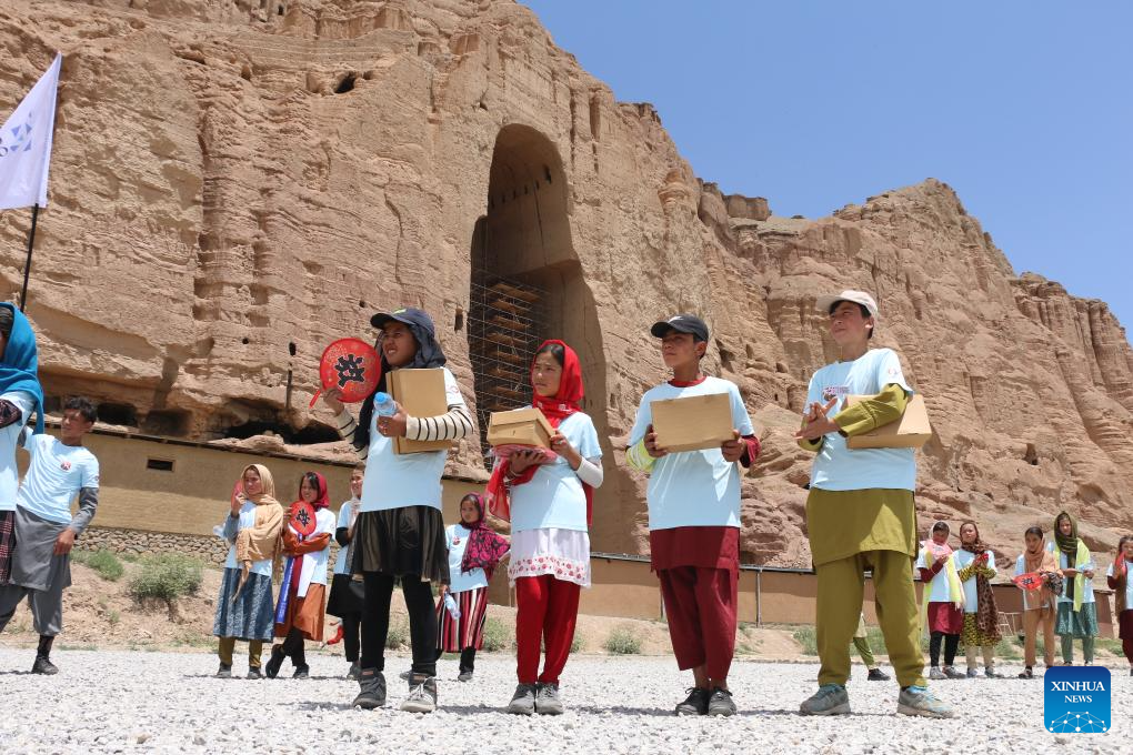 BAMIYAN, 17 junio, 2024 (Xinhua) -- Imagen del 15 de junio de 2024 de niños afganos sosteniendo una pancarta para un mini-maratón destinado a concienciar a la población local sobre la urgente necesidad de proteger las reliquias culturales, en la provincia de Bamiyán, en el centro de Afganistán. Algunos vestidos con sandalias simples, los niños afganos del valle de Bamiyán salieron a correr frente al sitio de los Budas gigantes, declarado Patrimonio de la Humanidad por la UNESCO, un símbolo icónico de la rica historia cultural de Afganistán. (Xinhua/Ziaodin Aza)