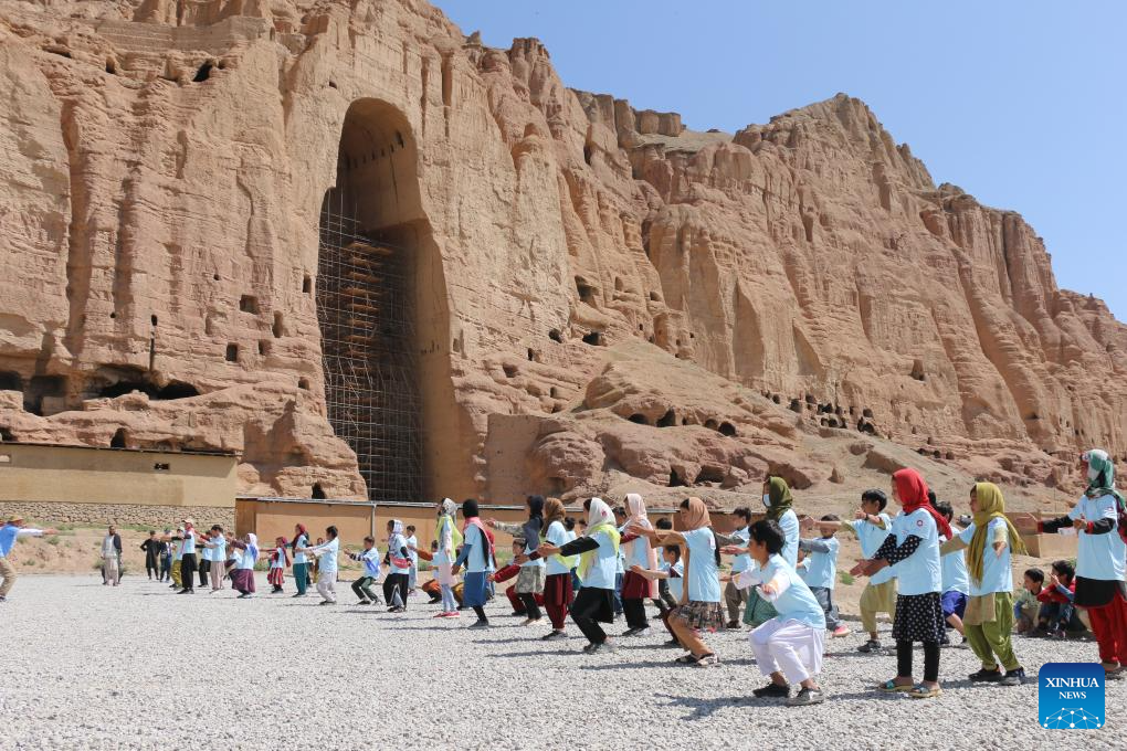 BAMIYAN, 17 junio, 2024 (Xinhua) -- Imagen del 15 de junio de 2024 de la ceremonia de premiación de un mini-maratón destinado a concienciar a la población local sobre la urgente necesidad de proteger las reliquias culturales, en la provincia de Bamiyán, en el centro de Afganistán. Algunos vestidos con sandalias simples, los niños afganos del valle de Bamiyán salieron a correr frente al sitio de los Budas gigantes, declarado Patrimonio de la Humanidad por la UNESCO, un símbolo icónico de la rica historia cultural de Afganistán. (Xinhua/Ziaodin Aza)