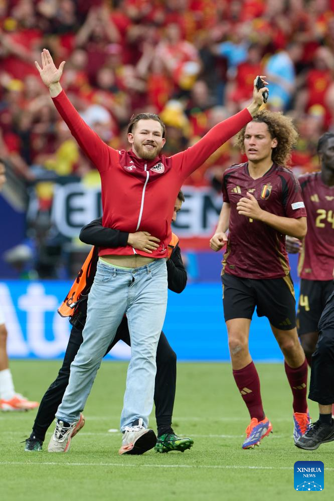 FRANKFURT, 18 junio, 2024 (Xinhua) -- Imagen del 17 de junio de 2024 de un invasor de campo abordado por la seguridad durante el partido correspondiente al Grupo E de la EURO 2024 de la UEFA entre Bélgica y Eslovaquia, en Frankfurt, Alemania. (Xinhua/Meng Dingbo)