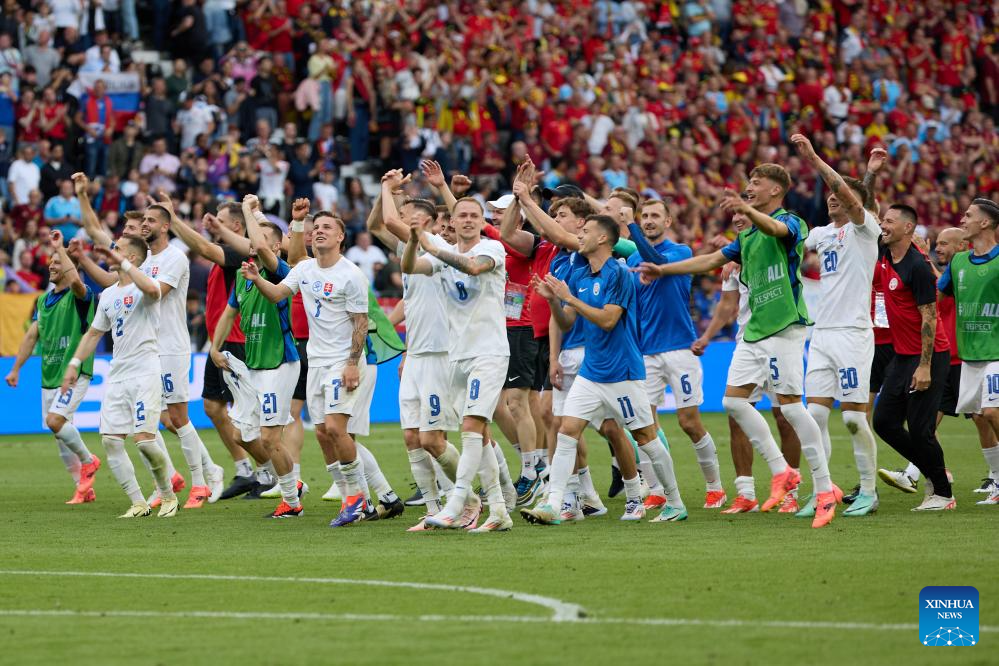 FRANKFURT, 18 junio, 2024 (Xinhua) -- Imagen del 17 de junio de 2024 de jugadores de Eslovaquia festejando al término del partido correspondiente al Grupo E de la EURO 2024 de la UEFA entre Bélgica y Eslovaquia, en Frankfurt, Alemania. (Xinhua/Meng Dingbo)