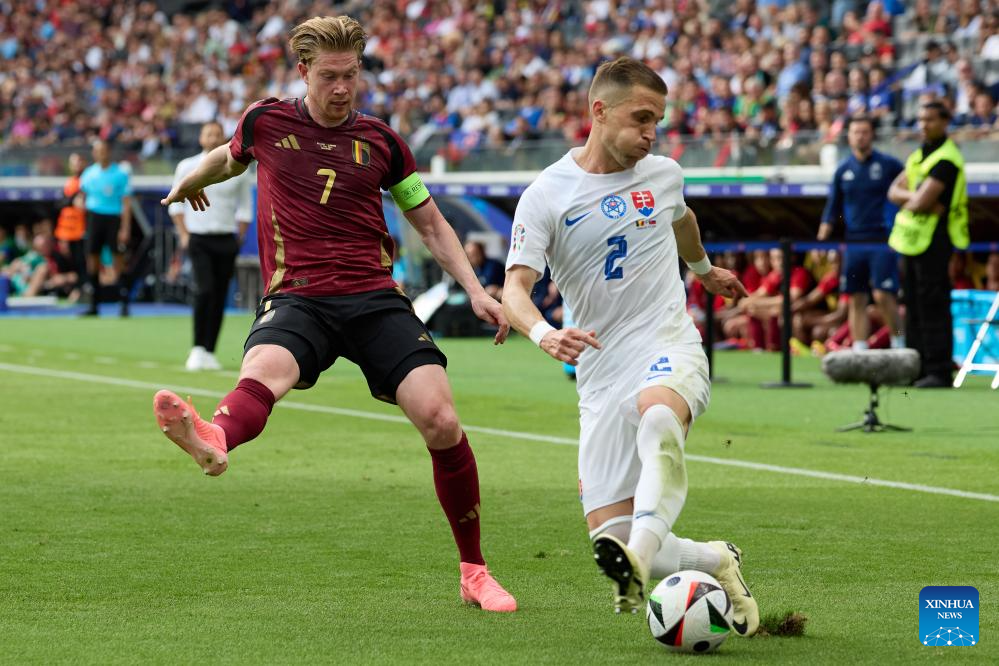 FRANKFURT, 18 junio, 2024 (Xinhua) -- Imagen del 17 de junio de 2024 de Kevin De Bruyne (i), de Bélgica, disputando el balón con Peter Pekarik, de Eslovaquia, durante el partido correspondiente al Grupo E de la EURO 2024 de la UEFA entre Bélgica y Eslovaquia, en Frankfurt, Alemania. (Xinhua/Meng Dingbo)