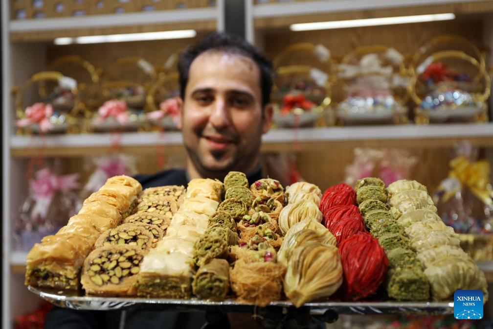 BAGDAD, 17 junio, 2024 (Xinhua) -- Un vendedor muestra dulces durante la festividad del Eid al-Adha, en Bagdad, Irak, el 17 de junio de 2024. (Xinhua/Khalil Dawood)