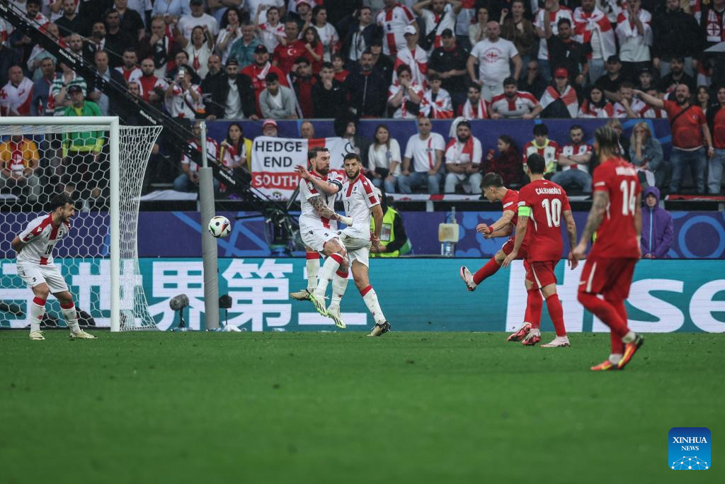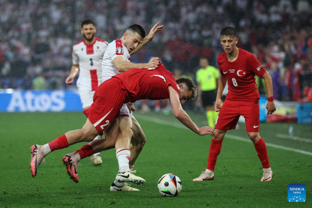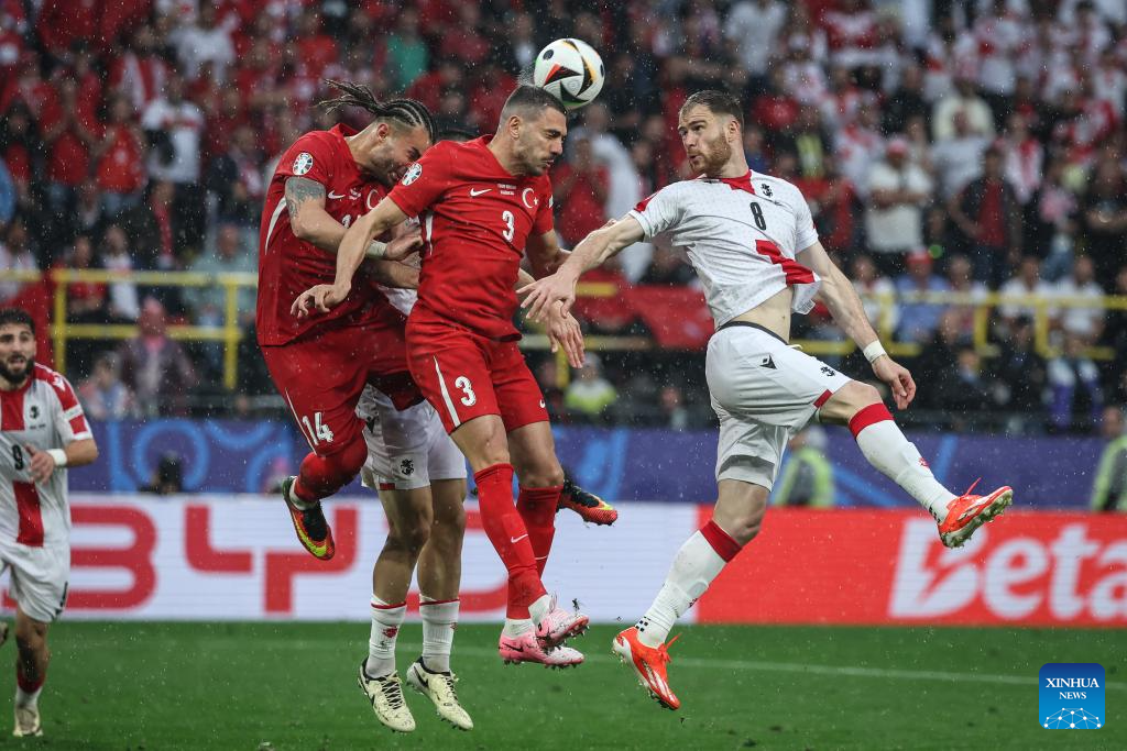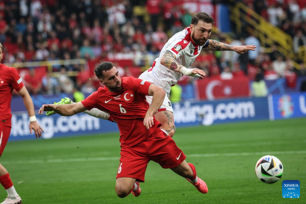 DORTMUND, 19 junio, 2024 (Xinhua) -- Imagen del 18 de junio de 2024 de Merih Demiral (2-d), de Turquía, disputando el balón con Budu Zivzivadze (d), de Georgia, durante el partido correspondiente al Grupo F de la EURO 2024 de la UEFA entre Turquía y Georgia, en Dortmund, Alemania. (Xinhua/Pan Yulong)