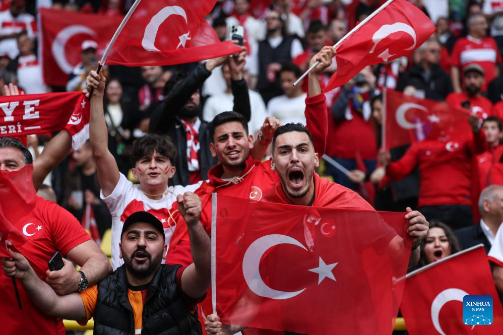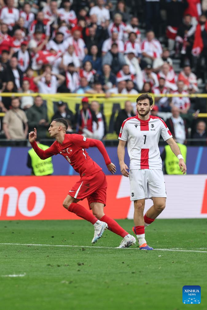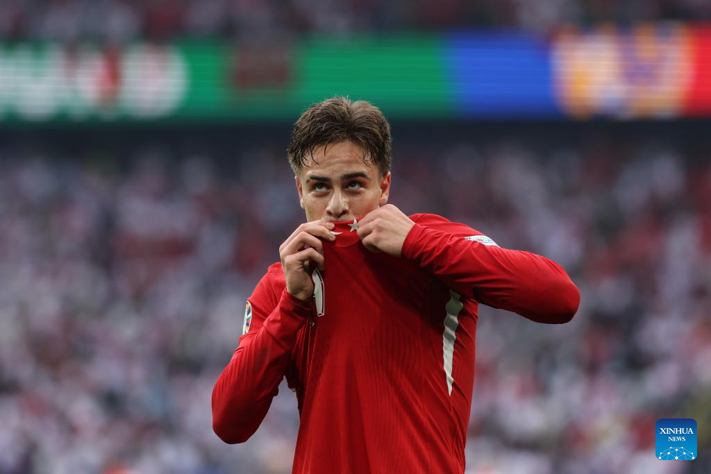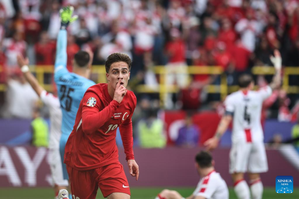 DORTMUND, 19 junio, 2024 (Xinhua) -- Imagen del 18 de junio de 2024 de Kenan Yildiz, de Turquía, festejando una anotación que después sería anulada, durante el partido correspondiente al Grupo F de la EURO 2024 de la UEFA entre Turquía y Georgia, en Dortmund, Alemania. (Xinhua/Pan Yulong)