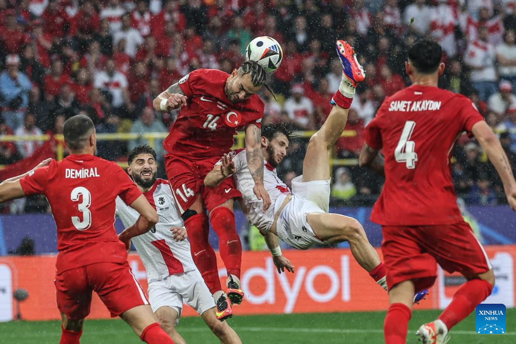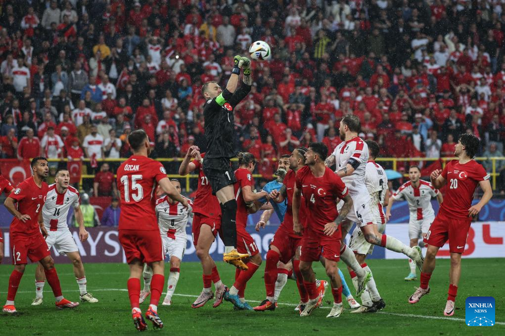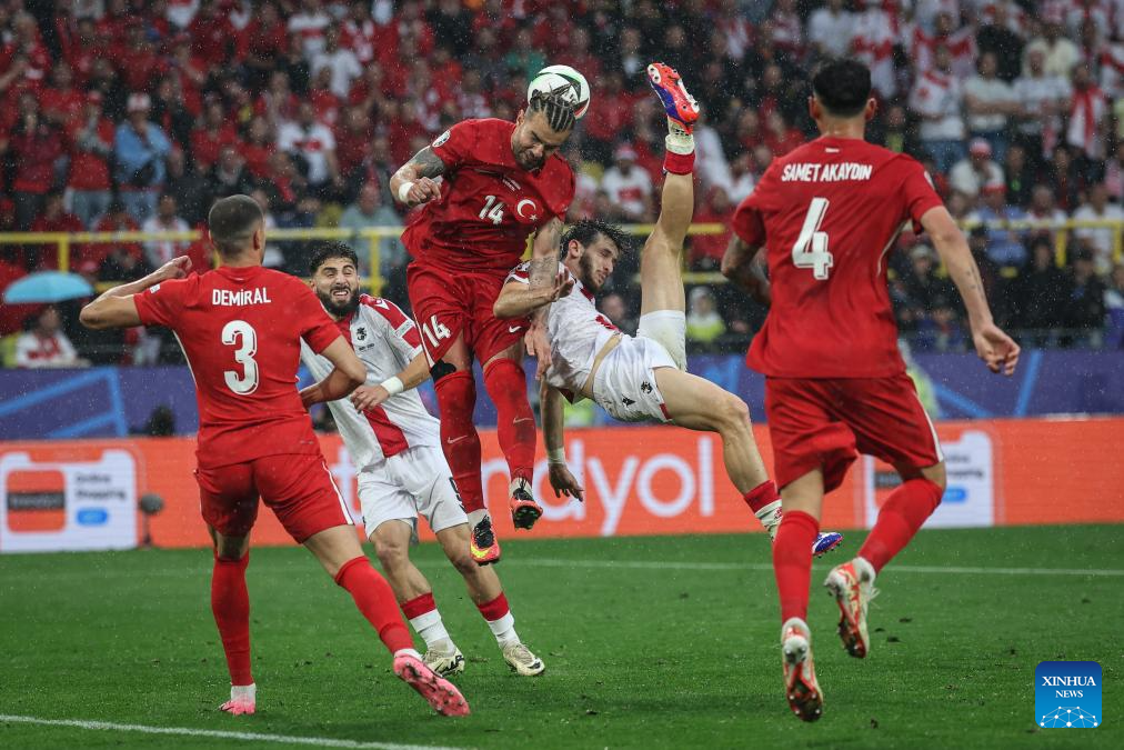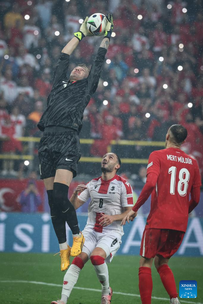 DORTMUND, 19 junio, 2024 (Xinhua) -- Imagen del 18 de junio de 2024 de Mert Gunok (arriba), de Turquía, atajando el balón, durante el partido correspondiente al Grupo F de la EURO 2024 de la UEFA entre Turquía y Georgia, en Dortmund, Alemania. (Xinhua/Pan Yulong)