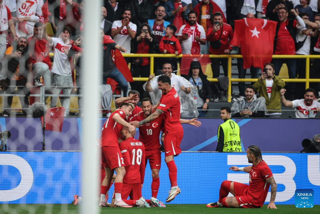 DORTMUND, 19 junio, 2024 (Xinhua) -- Imagen del 18 de junio de 2024 de Mert Muldur (i-abajo), de Turquía, festejando su anotación con sus compañeros, durante el partido correspondiente al Grupo F de la EURO 2024 de la UEFA entre Turquía y Georgia, en Dortmund, Alemania. (Xinhua/Pan Yulong)