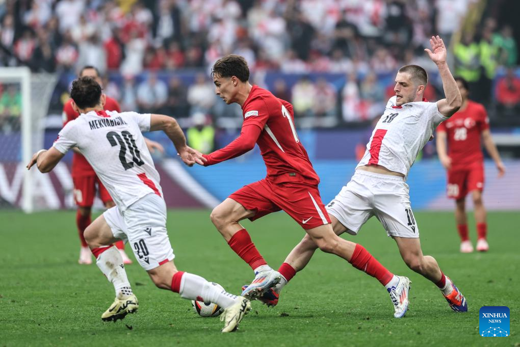 DORTMUND, 19 junio, 2024 (Xinhua) -- Imagen del 18 de junio de 2024 de Kenan Yildiz (c), de Turquía, abriéndose camino durante el partido correspondiente al Grupo F de la EURO 2024 de la UEFA entre Turquía y Georgia, en Dortmund, Alemania. (Xinhua/Pan Yulong)