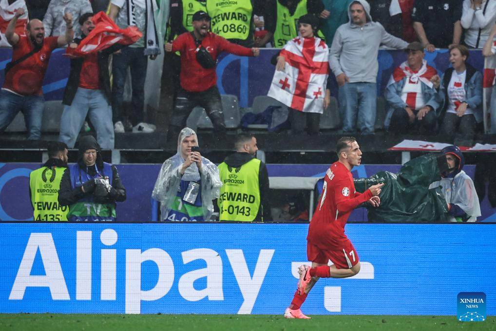 DORTMUND, 19 junio, 2024 (Xinhua) -- Imagen del 18 de junio de 2024 de Kerem Akturkoglu (frente), de Turquía, festejando su anotación durante el partido correspondiente al Grupo F de la EURO 2024 de la UEFA entre Turquía y Georgia, en Dortmund, Alemania. (Xinhua/Pan Yulong)