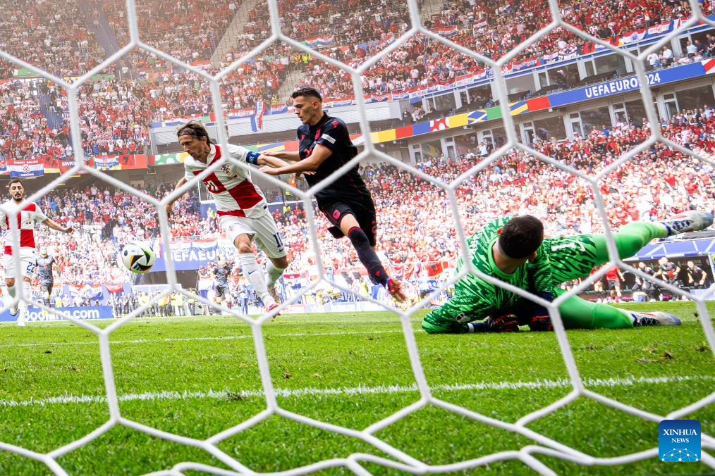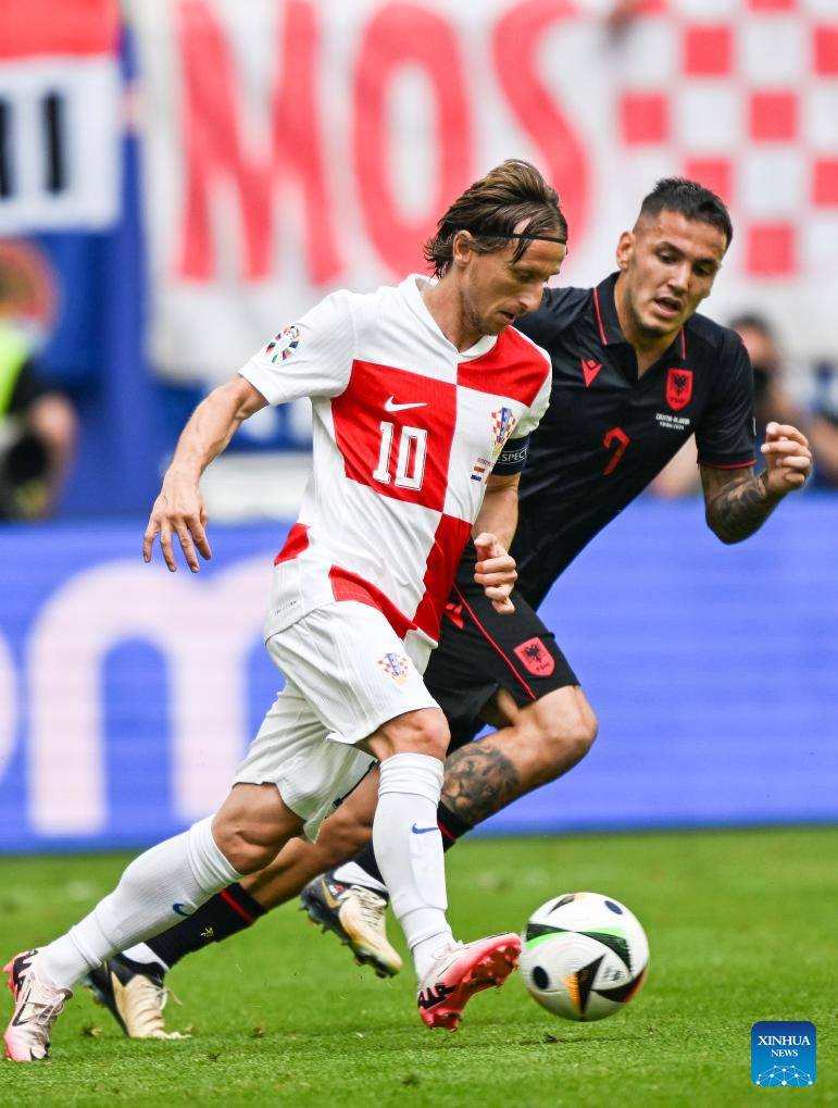 HAMBURGO, 19 junio, 2024 (Xinhua) -- Luka Modric (i), de Croacia, disputa el balón con Rei Manaj, de Albania, durante el partido correspondiente al Grupo B de la EURO 2024 de la UEFA entre Croacia y Albania, en Hamburgo, Alemania, el 19 de junio de 2024. (Xinhua/Xiao Yijiu)
