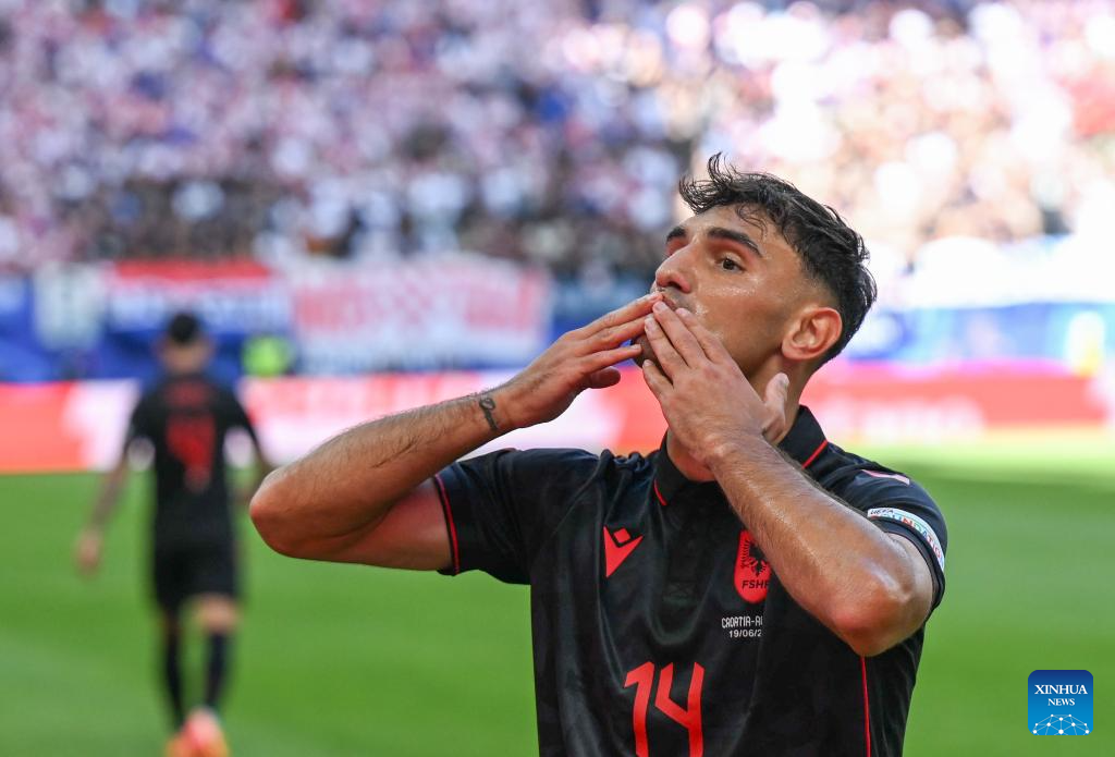 HAMBURGO, 19 junio, 2024 (Xinhua) -- Qazim Laci, de Albania, festeja su anotación durante el partido correspondiente al Grupo B de la EURO 2024 de la UEFA entre Croacia y Albania, en Hamburgo, Alemania, el 19 de junio de 2024. (Xinhua/Xiao Yijiu)