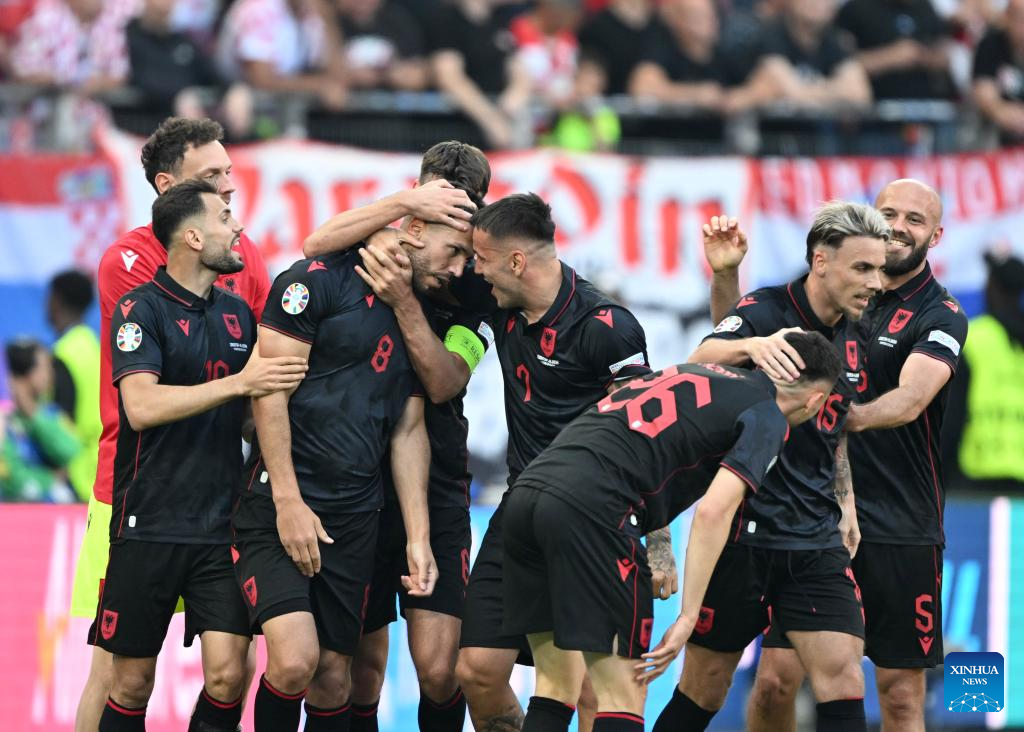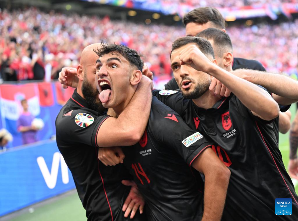 HAMBURGO, 19 junio, 2024 (Xinhua) -- Qazim Laci (2-i), de Alabania, festeja su anotación durante el partido correspondiente al Grupo B de la EURO 2024 de la UEFA entre Croacia y Albania, en Hamburgo, Alemania, el 19 de junio de 2024. (Xinhua/Xiao Yijiu)