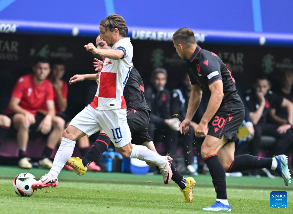 HAMBURGO, 19 junio, 2024 (Xinhua) -- Luka Modric (i-frente), de Croacia, se abre camino durante el partido correspondiente al Grupo B de la EURO 2024 de la UEFA entre Croacia y Albania, en Hamburgo, Alemania, el 19 de junio de 2024. (Xinhua/Ren Pengfei)