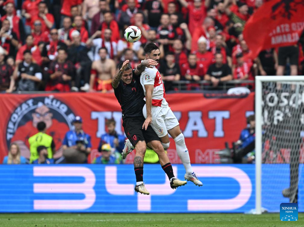 HAMBURGO, 19 junio, 2024 (Xinhua) -- Josip Sutalo (d), de Croacia, disputa el balón con Rei Manaj, de Albania, durante el partido correspondiente al Grupo B de la EURO 2024 de la UEFA entre Croacia y Albania, en Hamburgo, Alemania, el 19 de junio de 2024. (Xinhua/Ren Pengfei)