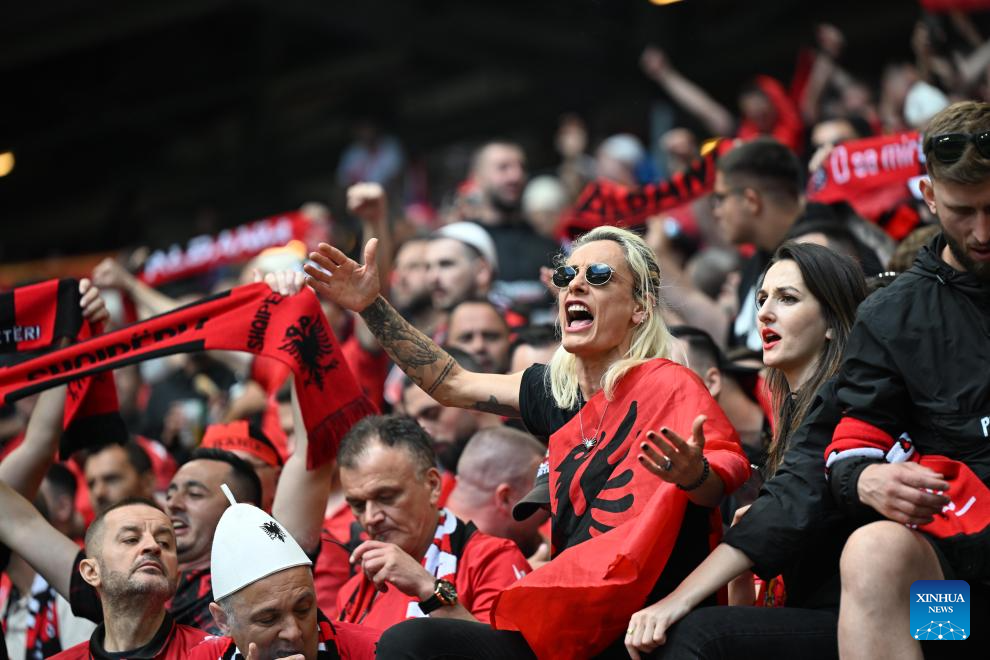 HAMBURGO, 19 junio, 2024 (Xinhua) -- Aficionados de Albania reaccionan previo al partido correspondiente al Grupo B de la EURO 2024 de la UEFA entre Croacia y Albania, en Hamburgo, Alemania, el 19 de junio de 2024. (Xinhua/Xiao Yijiu)