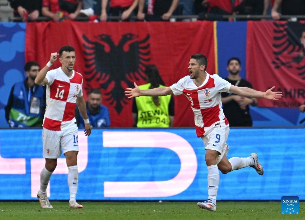 HAMBURGO, 19 junio, 2024 (Xinhua) -- Andrej Kramaric (d), de Croacia, festeja su anotación con su compañero Ivan Perisic durante el partido correspondiente al Grupo B de la EURO 2024 de la UEFA entre Croacia y Albania, en Hamburgo, Alemania, el 19 de junio de 2024. (Xinhua/Ren Pengfei)