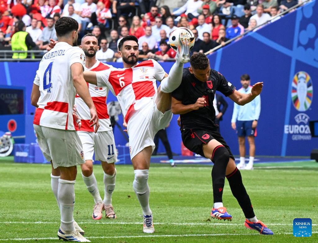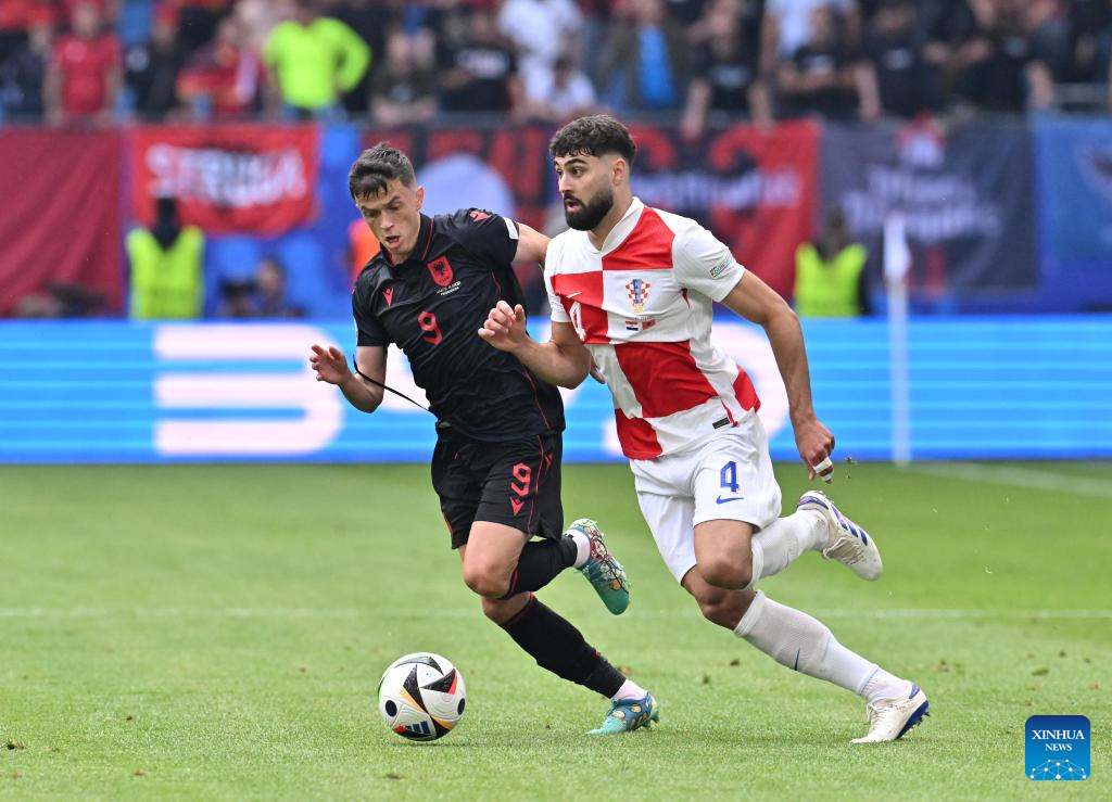 HAMBURGO, 19 junio, 2024 (Xinhua) -- Josip Sutalo (2-d), de Croacia, disputa el balón con Kristjan Asllani (d), de Albania, durante el partido correspondiente al Grupo B de la EURO 2024 de la UEFA entre Croacia y Albania, en Hamburgo, Alemania, el 19 de junio de 2024. (Xinhua/Xiao Yijiu)