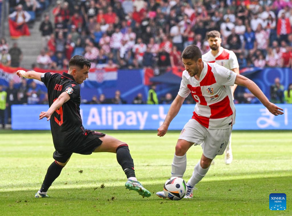 HAMBURGO, 19 junio, 2024 (Xinhua) -- Andrej Kramaric (d), de Croacia, disputa el balón con Jasir Asani, de Albania, durante el partido correspondiente al Grupo B de la EURO 2024 de la UEFA entre Croacia y Albania, en Hamburgo, Alemania, el 19 de junio de 2024. (Xinhua/Ren Pengfei)