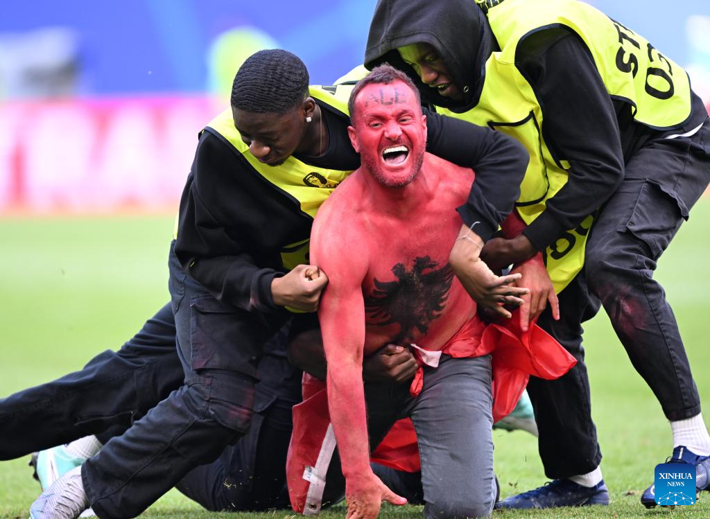 HAMBURGO, 19 junio, 2024 (Xinhua) -- Un invasor de campo es detenido por la seguridad durante el partido correspondiente al Grupo B de la EURO 2024 de la UEFA entre Croacia y Albania, en Hamburgo, Alemania, el 19 de junio de 2024. (Xinhua/Xiao Yijiu)
