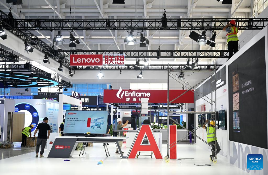 TIANJIN, 19 junio, 2024 (Xinhua) -- Imagen del 18 de junio de 2024 de empleados preparándose para la Exposición Mundial de Inteligencia 2024 en el Centro Nacional de Convenciones y Exposiciones, en la municipalidad de Tianjin, en el norte de China. La Exposición Mundial de Inteligencia 2024, que se celebrará en Tianjin del 20 al 23 de junio, tiene como objetivo agrupar los recursos relacionados con la inteligencia artificial (IA) a nivel nacional y mundial. Con un área de exposición de 100.000 metros cuadrados, el evento incluirá 10 áreas de exposición temáticas que abarcarán los campos de la IA, los vehículos inteligentes conectados, la fabricación inteligente y la robótica. Múltiples organizaciones e instituciones internacionales participarán en el evento, compitiendo en desafíos de robótica y conducción inteligente. (Xinhua/Zhao Zishuo)