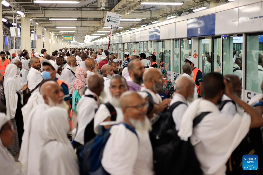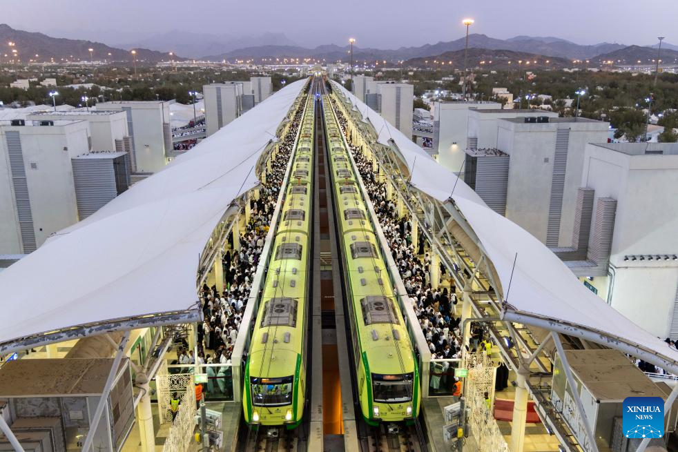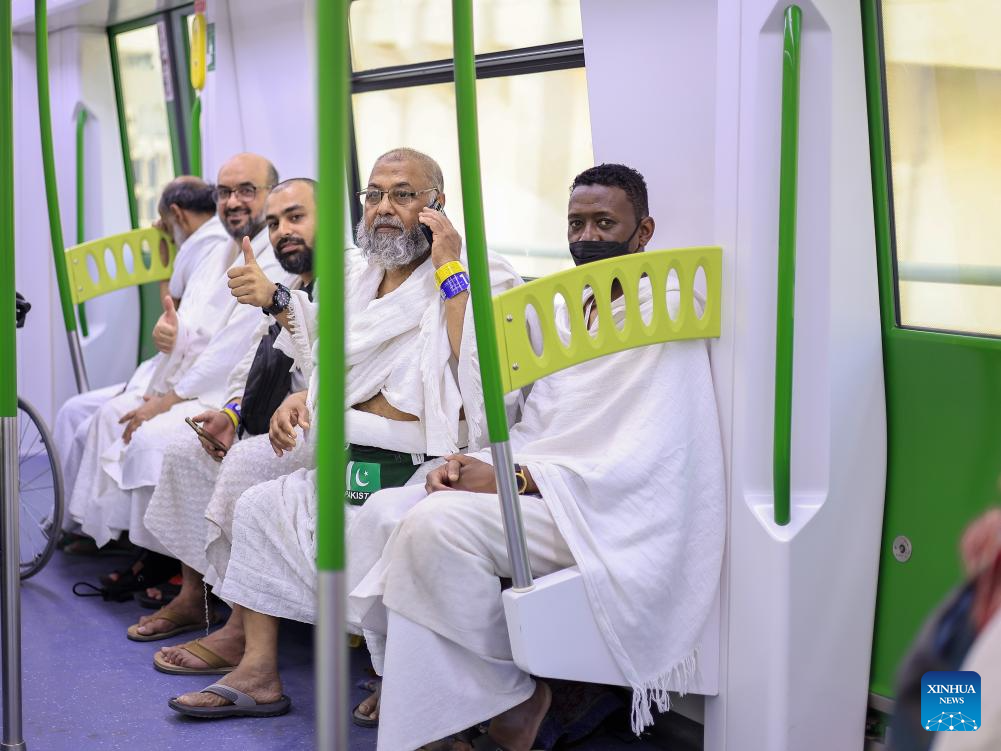 LA MECA, 20 junio, 2024 (Xinhua) -- Imagen del 16 de junio de 2024 de peregrinos de la Hajj vistos a bordo de un tren que circula por la Línea del Metro de Al Mashaaer Al Mugaddassah, en La Meca, Arabia Saudita. La Corporación de Construcción de Ferrocarriles de China (CRCC, por sus siglas en inglés) anunció el miércoles que ha completado la operación de la Hajj 2024 de la Línea de Metro de Al Mashaaer Al Mugaddassah en la ciudad de La Meca en Arabia Saudita. A lo largo de siete días, 2.206 trenes han sido despachados, prestado servicio a unos 2.094 millones de pasajeros, dijo la CRCC en un comunicado. (Xinhua/CRCC)