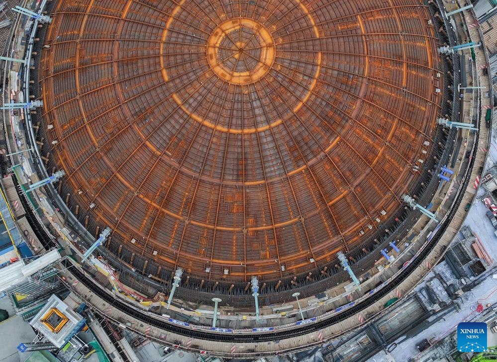 NANJING, 19 junio, 2024 (Xinhua) -- Vista aérea tomada con un dron el 19 de junio de 2024 de la Unidad 8 de la Estación de Energía Nuclear de Tianwan bajo construcción, en Lianyungang, en la provincia de Jiangsu, en el este de China. La unidad 7, al igual que la unidad 8, tiene una capacidad de 1,265 millones de kilovatios. Y una vez terminadas, se estima que las dos unidades generarán alrededor de 18.800 millones de kilovatios-hora de electricidad cada año. Iniciada el 19 de mayo de 2021, la construcción de estas dos unidades se desarrolló sin contratiempos. (Xinhua/Li Bo)