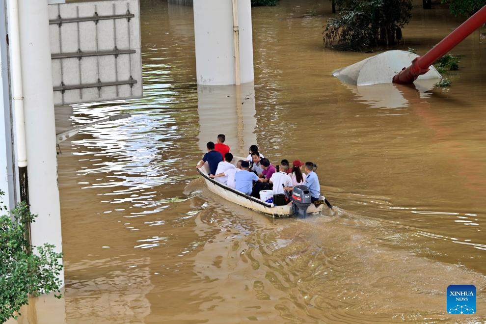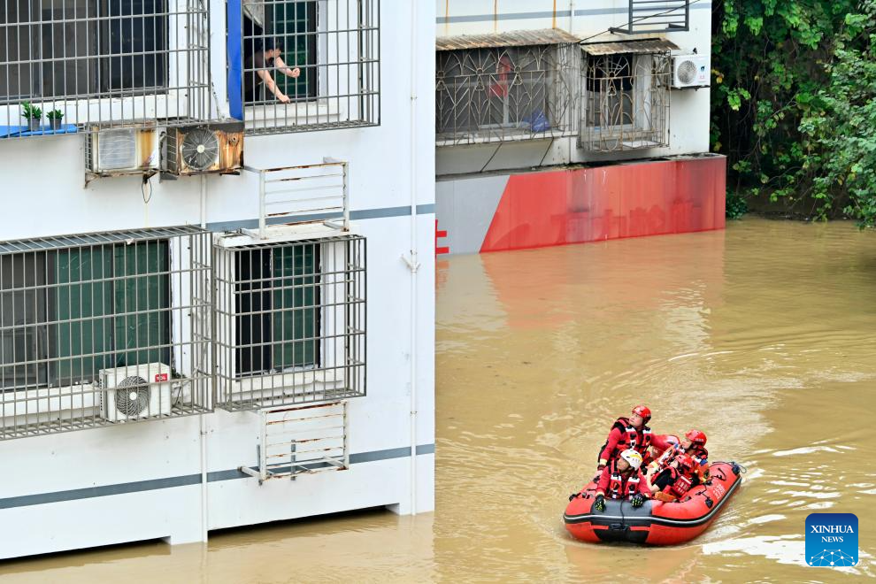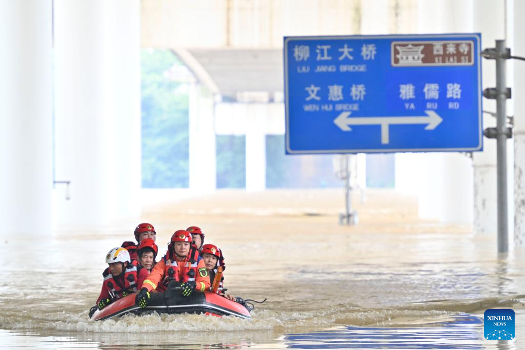 LIUZHOU, 19 junio, 2024 (Xinhua) -- Bomberos evacúan a residentes varados por las inundaciones, en la ciudad de Liuzhou, en la región autónoma de la etnia zhuang de Guangxi, en el sur de China, el 19 de junio de 2024. Debido a las fuertes lluvias, el nivel del agua en la estación hidrológica de Liuzhou en el río Liujiang en Guangxi aumentó a 86,3 metros a las 9:40 horas del miércoles, superando la línea de alerta en 3,8 metros. (Xinhua/Huang Xiaobang)