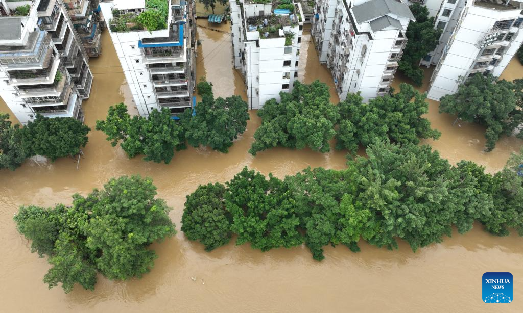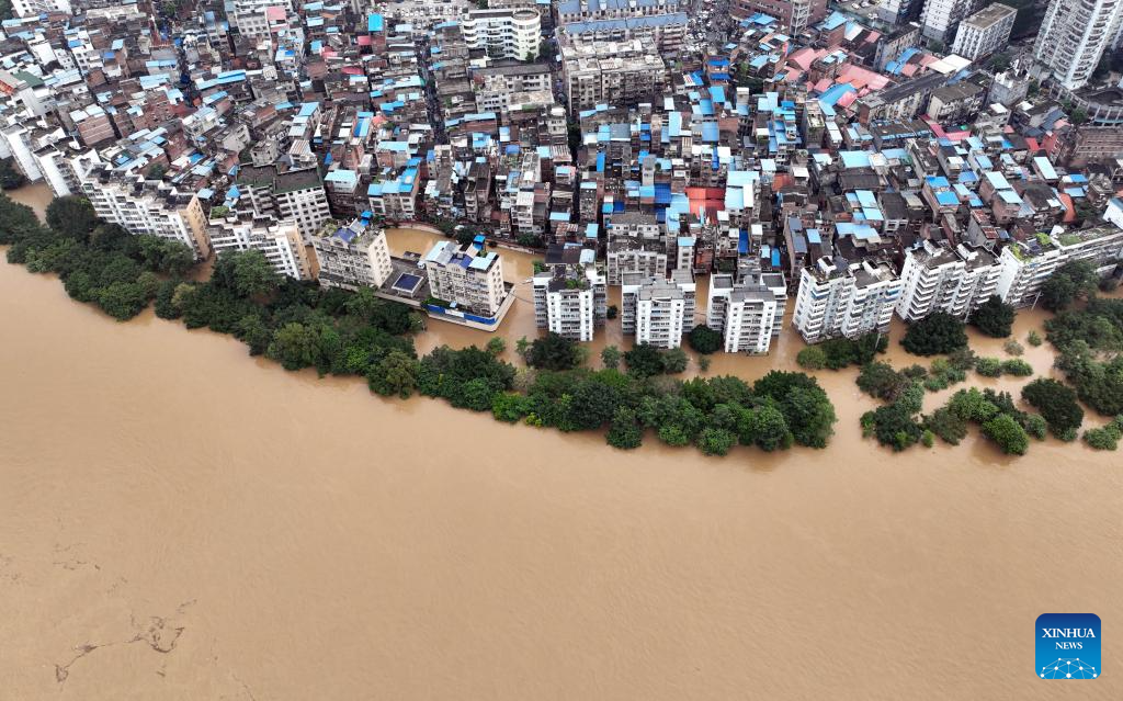 LIUZHOU, 19 junio, 2024 (Xinhua) -- Vista aérea tomada con un dron el 19 de junio de 2024 de las zonas afectadas por las inundaciones, en la ciudad de Liuzhou, en la región autónoma de la etnia zhuang de Guangxi, en el sur de China. Debido a las fuertes lluvias, el nivel del agua en la estación hidrológica de Liuzhou en el río Liujiang en Guangxi aumentó a 86,3 metros a las 9:40 horas del miércoles, superando la línea de alerta en 3,8 metros. (Xinhua/Huang Xiaobang)