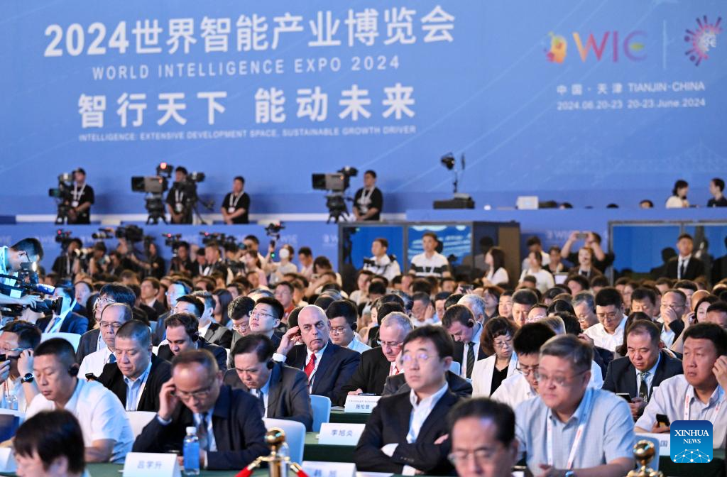 TIANJIN, 20 junio, 2024 (Xinhua) -- La ceremonia de inauguración de la Exposición Mundial de Inteligencia 2024 se lleva a cabo en Tianjin, en el norte de China, el 20 de junio de 2024. La Exposición Mundial de Inteligencia 2024 fue inaugurada el jueves en Tianjin. Bajo el tema "Inteligencia: Amplio espacio de desarrollo y motor de crecimiento sostenible", la exposición está organizada conjuntamente por los gobiernos municipales de Tianjin y Chongqing.