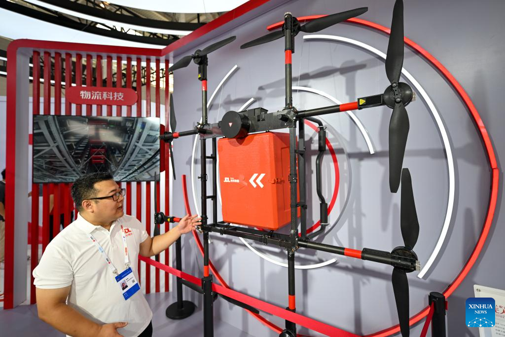 TIANJIN, 20 junio, 2024 (Xinhua) -- Un expositor presenta un vehículo aéreo no tripulado (UAV, por sus siglas en inglés) de reparto en la Exposición Mundial de Inteligencia 2024, en Tianjin, en el norte de China, el 20 de junio de 2024. La Exposición Mundial de Inteligencia 2024 fue inaugurada el jueves en Tianjin. Bajo el tema "Inteligencia: Amplio espacio de desarrollo y motor de crecimiento sostenible", la exposición está organizada conjuntamente por los gobiernos municipales de Tianjin y Chongqing. (Xinhua/Sun Fanyue)