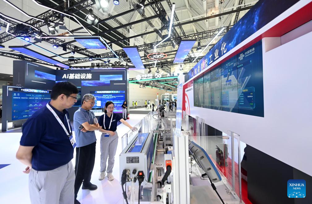 TIANJIN, 20 junio, 2024 (Xinhua) -- Personas visitan el estand de China Railway Rolling Stock Corporation (CRRC, por sus siglas en inglés) en la Exposición Mundial de Inteligencia 2024, en Tianjin, en el norte de China, el 20 de junio de 2024. La Exposición Mundial de Inteligencia 2024 fue inaugurada el jueves en Tianjin. Bajo el tema "Inteligencia: Amplio espacio de desarrollo y motor de crecimiento sostenible", la exposición está organizada conjuntamente por los gobiernos municipales de Tianjin y Chongqing. (Xinhua/Sun Fanyue)