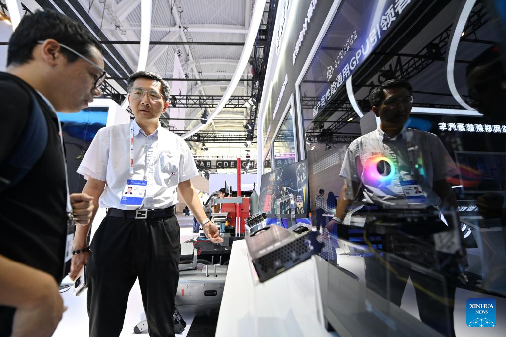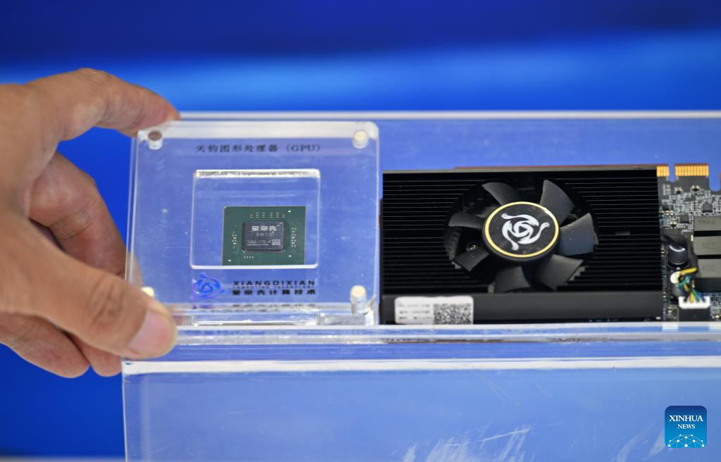 TIANJIN, 20 junio, 2024 (Xinhua) -- Personas visitan el estand de unidades de procesamiento de gráficos (GPU, por sus siglas en inglés) fabricadas en China en la Exposición Mundial de Inteligencia 2024, en Tianjin, en el norte de China, el 20 de junio de 2024. La Exposición Mundial de Inteligencia 2024 fue inaugurada el jueves en Tianjin. Bajo el tema "Inteligencia: Amplio espacio de desarrollo y motor de crecimiento sostenible", la exposición está organizada conjuntamente por los gobiernos municipales de Tianjin y Chongqing.