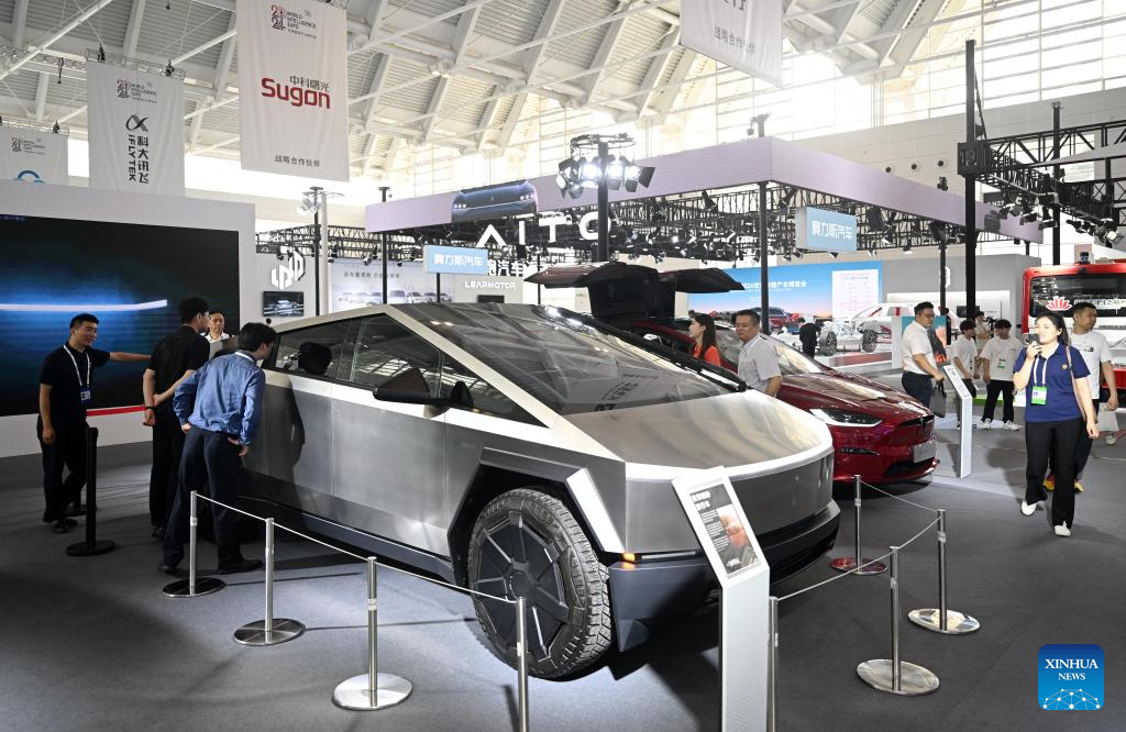 TIANJIN, 20 junio, 2024 (Xinhua) -- Personas observan un vehículo Tesla en la Exposición Mundial de Inteligencia 2024, en Tianjin, en el norte de China, el 20 de junio de 2024. La Exposición Mundial de Inteligencia 2024 fue inaugurada el jueves en Tianjin. Bajo el tema "Inteligencia: Amplio espacio de desarrollo y motor de crecimiento sostenible", la exposición está organizada conjuntamente por los gobiernos municipales de Tianjin y Chongqing. (Xinhua/Zhao Zishuo)