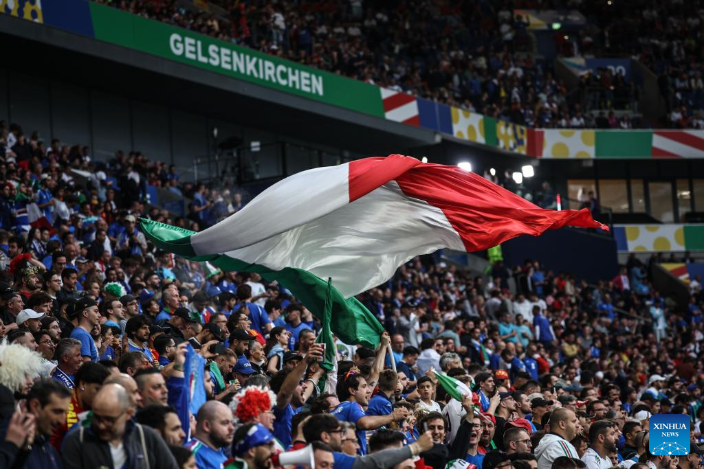 GELSENKIRCHEN, 21 junio, 2024 (Xinhua) -- Imagen del 20 de junio de 2024 de simpatizantes de Italia animando al equipo durante el partido correspondiente al Grupo B de la EURO 2024 de la UEFA, entre España e Italia, en Gelsenkirchen, Alemania. (Xinhua/Pan Yulong)