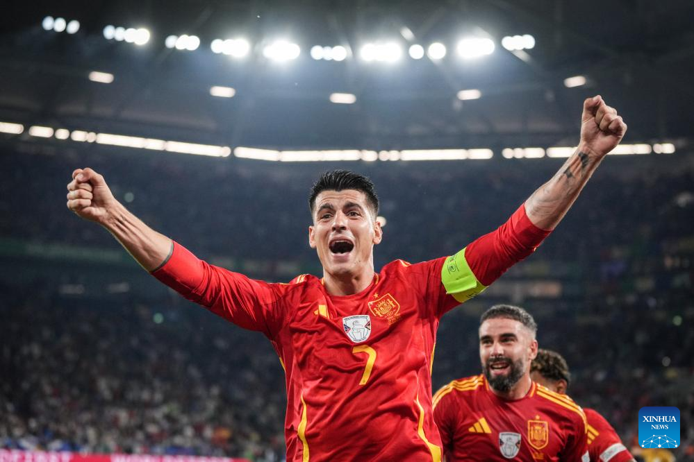 GELSENKIRCHEN, 21 junio, 2024 (Xinhua) -- Imagen del 20 de junio de 2024 de Alvaro Morata, de España, festejando durante el partido correspondiente al Grupo B de la EURO 2024 de la UEFA, entre España e Italia, en Gelsenkirchen, Alemania. (Xinhua/Peng Ziyang)