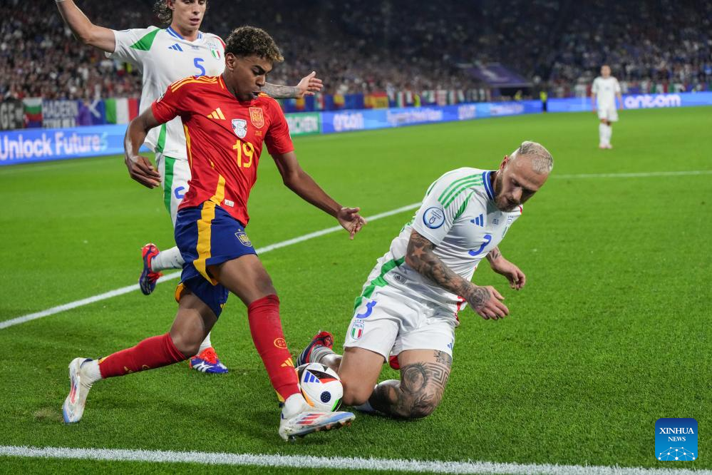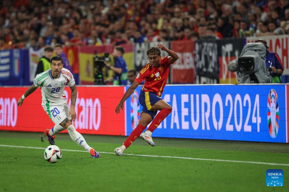 GELSENKIRCHEN, 21 junio, 2024 (Xinhua) -- Imagen del 20 de junio de 2024 de Lamine Yamal (d), de España, pasando el balón durante el partido correspondiente al Grupo B de la EURO 2024 de la UEFA, entre España e Italia, en Gelsenkirchen, Alemania. (Xinhua/Pan Yulong)