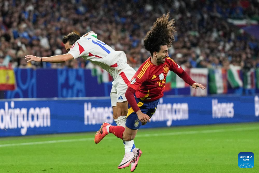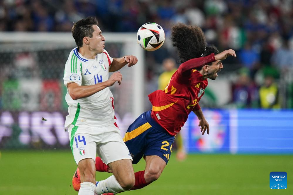 GELSENKIRCHEN, 21 junio, 2024 (Xinhua) -- Imagen del 20 de junio de 2024 de Marc Cucurella (d), de España, disputando el balón con Federico Chiesa, de Italia, durante el partido correspondiente al Grupo B de la EURO 2024 de la UEFA, entre España e Italia, en Gelsenkirchen, Alemania. (Xinhua/Peng Ziyang)