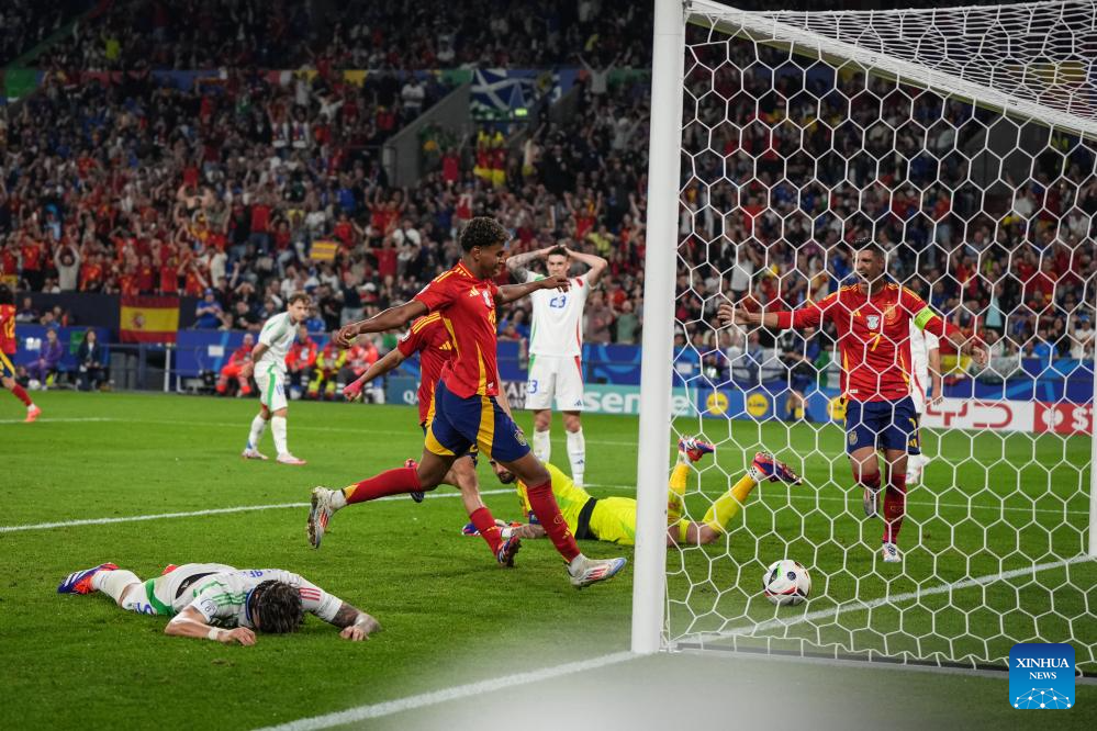 GELSENKIRCHEN, 21 junio, 2024 (Xinhua) -- Imagen del 20 de junio de 2024 de Lamine Yamal (2-i-frente), de España, festejando un autogol de Italia durante el partido correspondiente al Grupo B de la EURO 2024 de la UEFA, entre España e Italia, en Gelsenkirchen, Alemania. (Xinhua/Peng Ziyang)