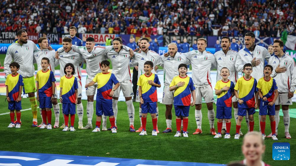 GELSENKIRCHEN, 21 junio, 2024 (Xinhua) -- Imagen del 20 de junio de 2024 de los jugadores titulares de Italia entonando el himno nacional previo al partido correspondiente al Grupo B de la EURO 2024 de la UEFA, entre España e Italia, en Gelsenkirchen, Alemania. (Xinhua/Pan Yulong)