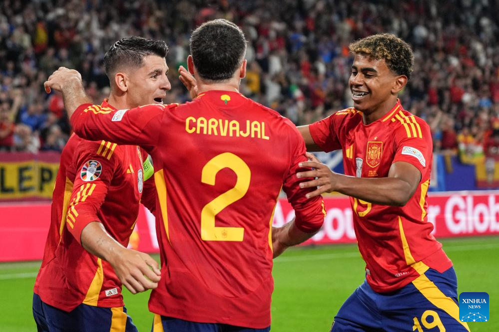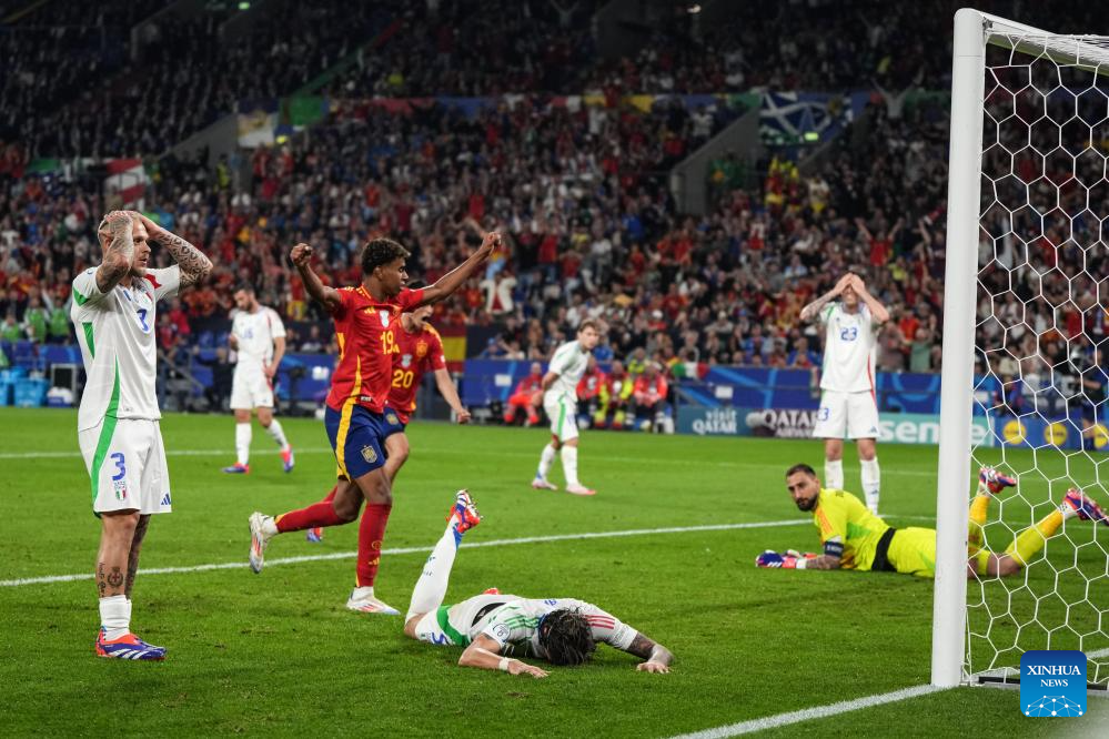 GELSENKIRCHEN, 21 junio, 2024 (Xinhua) -- Imagen del 20 de junio de 2024 de jugadores de España reaccionando durante el partido correspondiente al Grupo B de la EURO 2024 de la UEFA, entre España e Italia, en Gelsenkirchen, Alemania. (Xinhua/Pan Yulong)