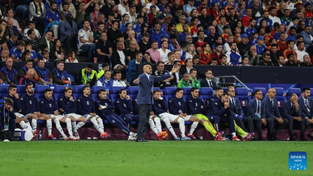GELSENKIRCHEN, 21 junio, 2024 (Xinhua) -- Imagen del 20 de junio de 2024 del director técnico Luciano Spelletti (c), de Italia, gesticulando durante el partido correspondiente al Grupo B de la EURO 2024 de la UEFA, entre España e Italia, en Gelsenkirchen, Alemania. (Xinhua/Pan Yulong)