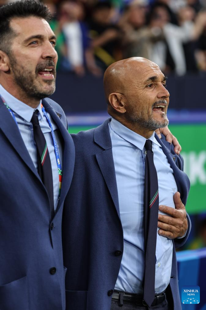 GELSENKIRCHEN, 21 junio, 2024 (Xinhua) -- Imagen del 20 de junio de 2024 del director técnico, Luciano Spalletti (d), de Italia, entonando el himno nacional italiano previo al partido correspondiente al Grupo B de la EURO 2024 de la UEFA, entre España e Italia, en Gelsenkirchen, Alemania. (Xinhua/Pan Yulong)