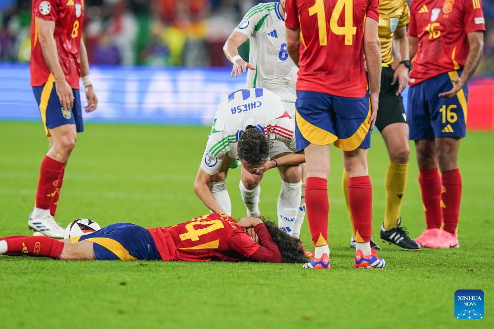 GELSENKIRCHEN, 21 junio, 2024 (Xinhua) -- Imagen del 20 de junio de 2024 de Federico Chiesa (c), de Italia, consolando a Marc Cucurella (abajo), de España, durante el partido correspondiente al Grupo B de la EURO 2024 de la UEFA, entre España e Italia, en Gelsenkirchen, Alemania. (Xinhua/Peng Ziyang)