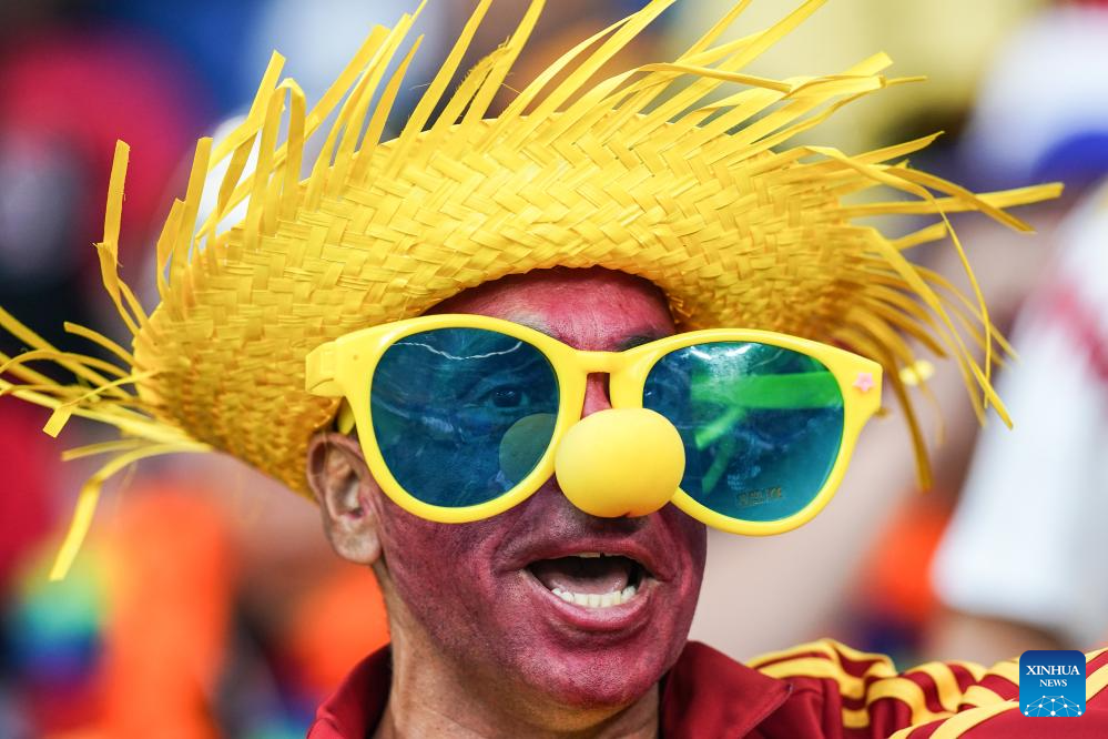 GELSENKIRCHEN, 21 junio, 2024 (Xinhua) -- Imagen del 20 de junio de 2024 de un aficionado de España animando durante el partido correspondiente al Grupo B de la EURO 2024 de la UEFA, entre España e Italia, en Gelsenkirchen, Alemania. (Xinhua/Peng Ziyang)