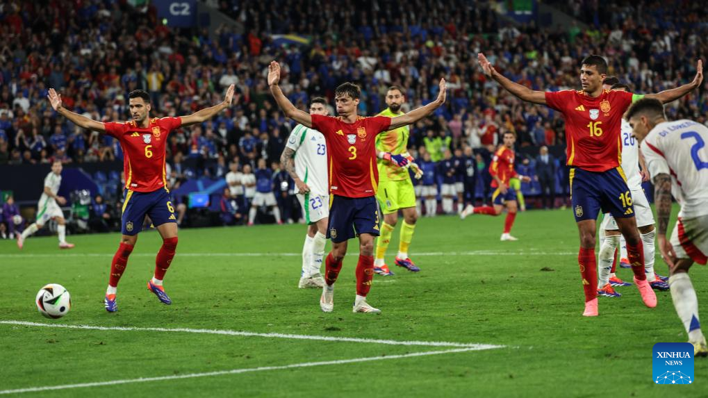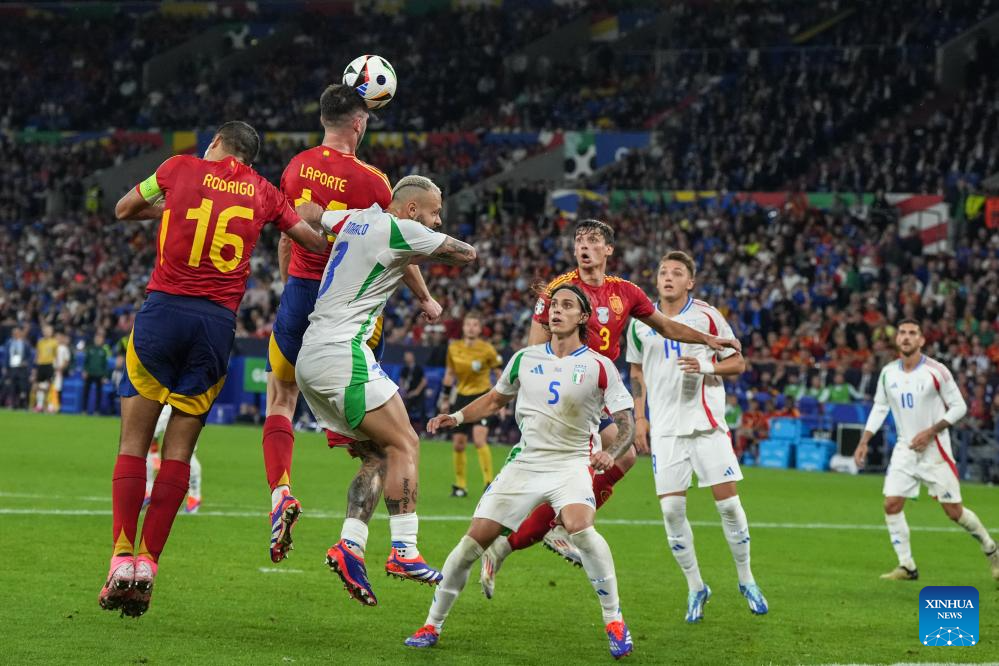 GELSENKIRCHEN, 21 junio, 2024 (Xinhua) -- Imagen del 20 de junio de 2024 de Aymeric Laporte (2-i), de España, cabeceando el balón durante el partido correspondiente al Grupo B de la EURO 2024 de la UEFA, entre España e Italia, en Gelsenkirchen, Alemania. (Xinhua/Peng Ziyang)