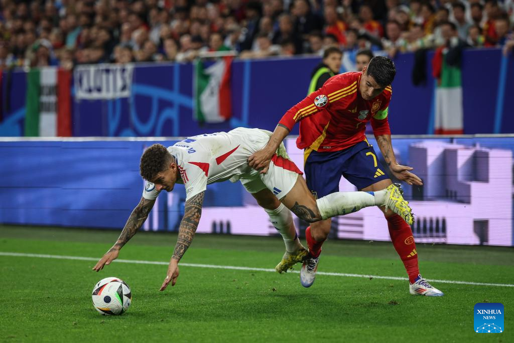 GELSENKIRCHEN, 21 junio, 2024 (Xinhua) -- Imagen del 20 de junio de 2024 de Giovanni Di Lorenzo (i), de Italia, disputando el balón con Alvaro Morata, de España, durante el partido correspondiente al Grupo B de la EURO 2024 de la UEFA, entre España e Italia, en Gelsenkirchen, Alemania. (Xinhua/Pan Yulong)