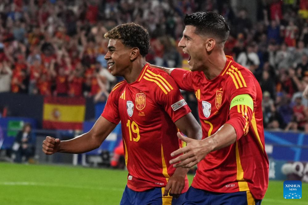 GELSENKIRCHEN, 21 junio, 2024 (Xinhua) -- Imagen del 20 de junio de 2024 de Alvaro Morata (d) y Lamine Yamal, de España, festejando durante el partido correspondiente al Grupo B de la EURO 2024 de la UEFA, entre España e Italia, en Gelsenkirchen, Alemania. (Xinhua/Peng Ziyang)