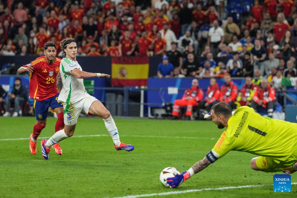 GELSENKIRCHEN, 21 junio, 2024 (Xinhua) -- Imagen del 20 de junio de 2024 del guardameta Gianluigi Donnarumma (d), de Italia, atajando el balón durante el partido correspondiente al Grupo B de la EURO 2024 de la UEFA, entre España e Italia, en Gelsenkirchen, Alemania. (Xinhua/Peng Ziyang)